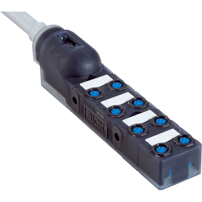 Adaptateur et distributeur; Type: Boîtier répartiteur; Nombre d'emplacements: 8; Matériau du câble: PUR, sans halogène; Type de raccordement emplacements: M8 4 pôles Codage A Connecteur femelle; Câble de connexion: 5 m, 18 fils, PUR, sans halogène; Mode de raccordement A: 4 pôles; Homologations: UL, CE