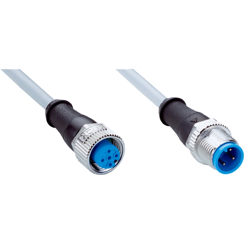 Connecteur / Câble de raccordement; Type: Câble de connexion; Type de signal: Capteur / Actionneur; Raccordement A: Connecteur M12, femelle, droit, 3 pôles, codé A; Raccordement B: Connecteur M12, mâle, droit, 3 pôles, codé A; Câble: 5 m, 3 fils, PVC; Blindage: Non blindé; Domaine d'utilisation: Domaine de produit chimique; Homologations: CE, UL