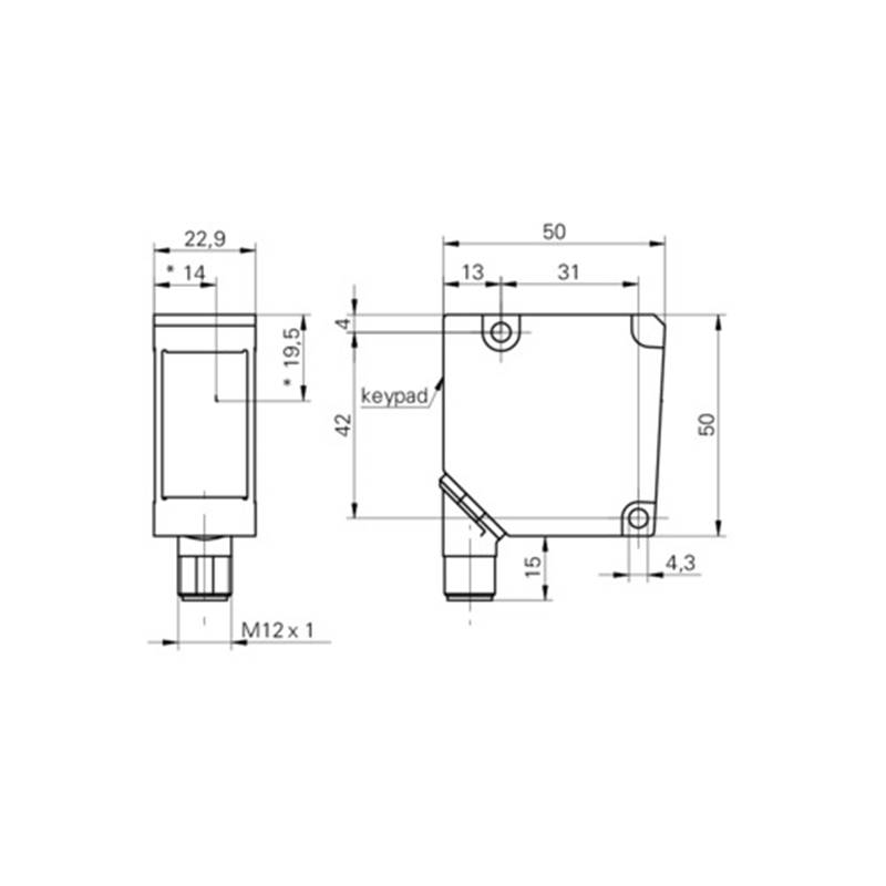 Détecteur de ligne; Format: Parallélépipédique; Faisceau: Ligne de 30 mm; Réglage: Teach; Fréquence de mesure: > 500 Hz; Sortie analogique: 4-20mA/RS 485 et 1 sortie PNP; Raccordement: Connecteur mâle M12, 8 pôles; Dimensions: 50 x 50 x 23 mm; Matériau du boîtier: Aluminium