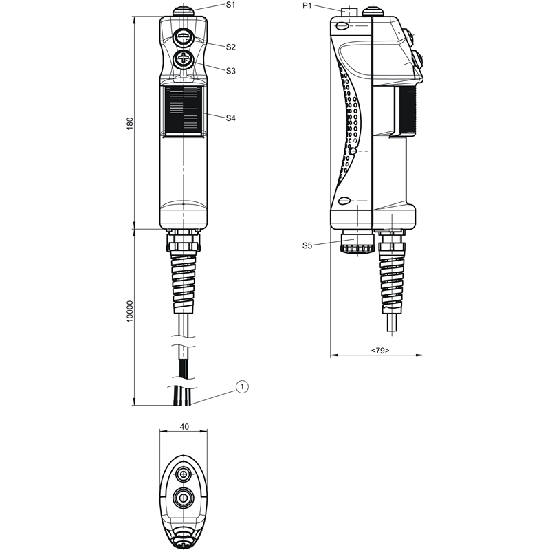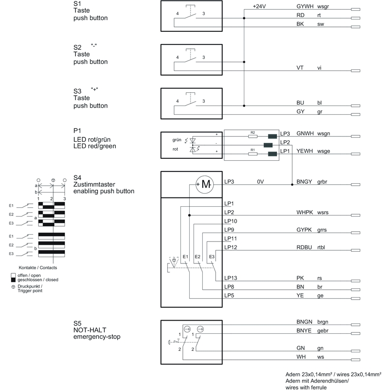 Poignée de commande et d'assentiment; Schéma de commutation: Commande d’assentiment à 3 positions ; Eléments de commande et d'affichage: Boutons + et -, moteur vibrant, dispositif d’arrêt, bouton-poussoir noir, LED; Nombre d’inverseurs: 3; Principe de commutation: Élément de contact à action brusque; Raccordement: Câble droit 10 m, 23x0,14 mm²; Matériau: PA, CR, TPE; Indice de protection: IP54; Température ambiante: -5 ... +60 °C ; Série: ZSM