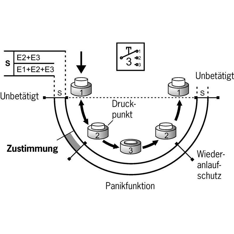 La fonction d’assentiment n’est active qu’à la deuxième position (position centrale, point de déclenchement). Lorsque le bouton est relâché ou complètement enfoncé (fonction de crispation), l’assentiment est annulé (dépend du câblage, voir le fonctionnement).