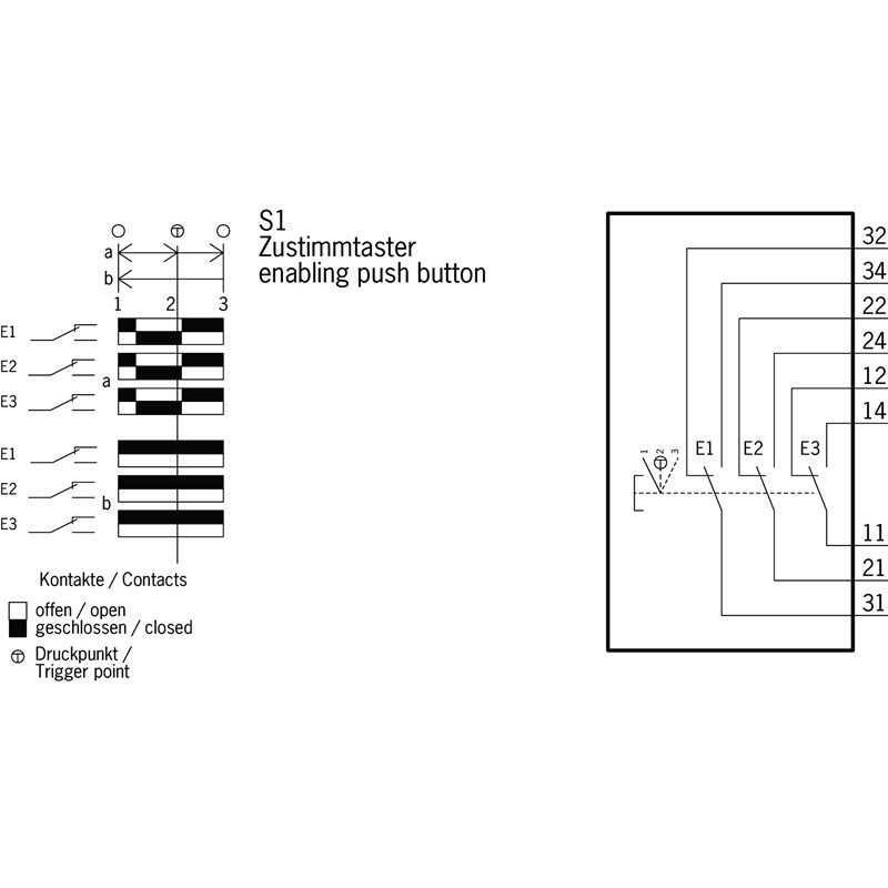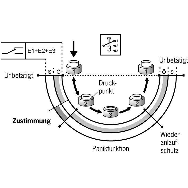 La fonction d’assentiment n’est active qu’à la deuxième position (position centrale, point de déclenchement). Lorsque le bouton est relâché ou complètement enfoncé (fonction de crispation), l’assentiment est annulé (dépend du câblage, voir le fonctionnement).